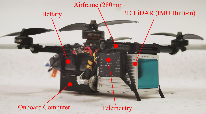 In order to validate the robustness and computational efficiency of FAST-LIO in actual mobile robots, we build a small-scale quadrotor which can carry a Livox Avia LiDAR with 70 degree FoV and a DJI Manifold 2-C onboard computer with a 1.8 GHz Intel i7-8550U CPU and 8 G RAM, as shown in below.