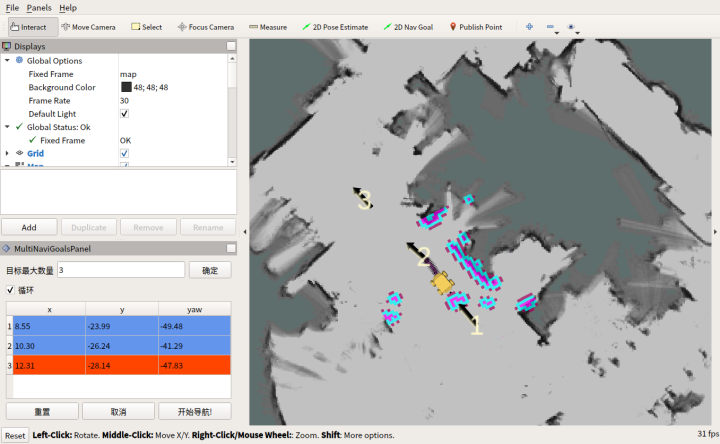 MultiNaviGoalsPanel是多点SLAM导航任务的可视化操作区包括任务点列表、循环、重置、取消、开始任务。