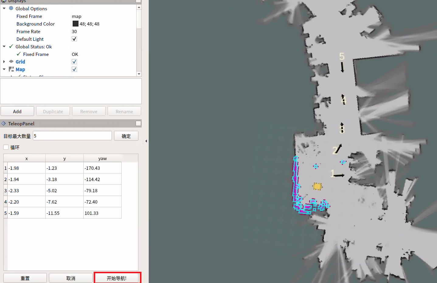 ⑤ 取消:取消当前目标点导航任务,机器人停止运动。再次点击开始导航后,会从下一个任务点开始。