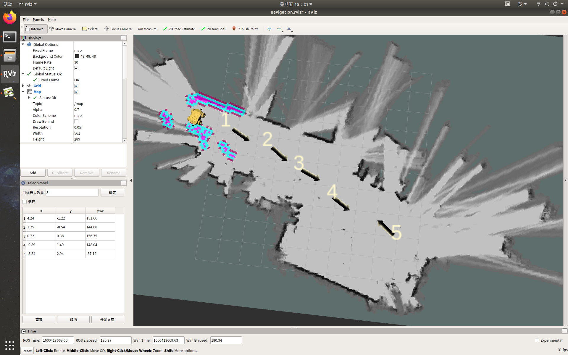 点击ToolBar上的2D Nav Goal在地图上给定目标点。每次设置都需要先点击2D Nav Goal
